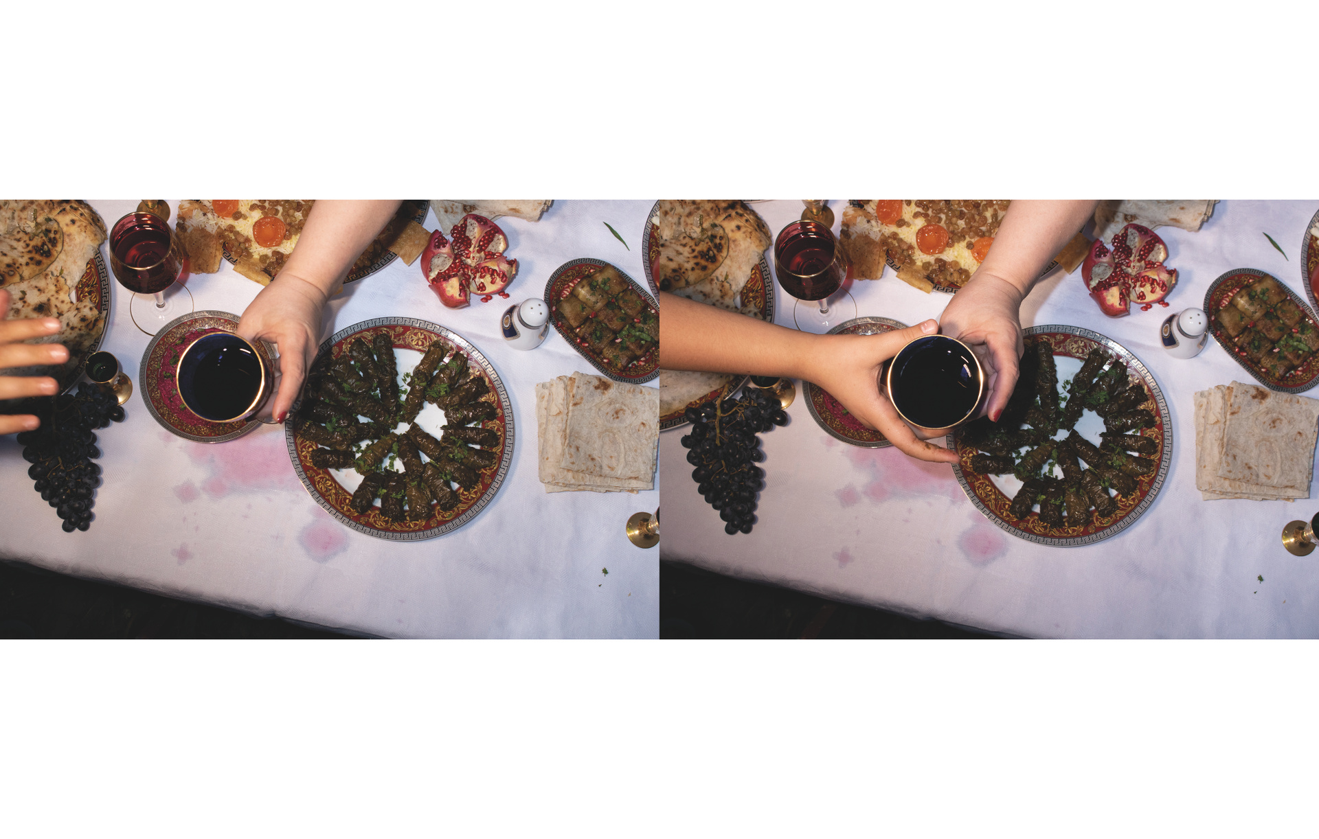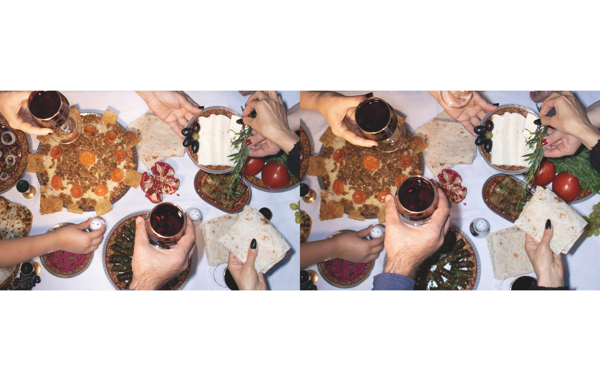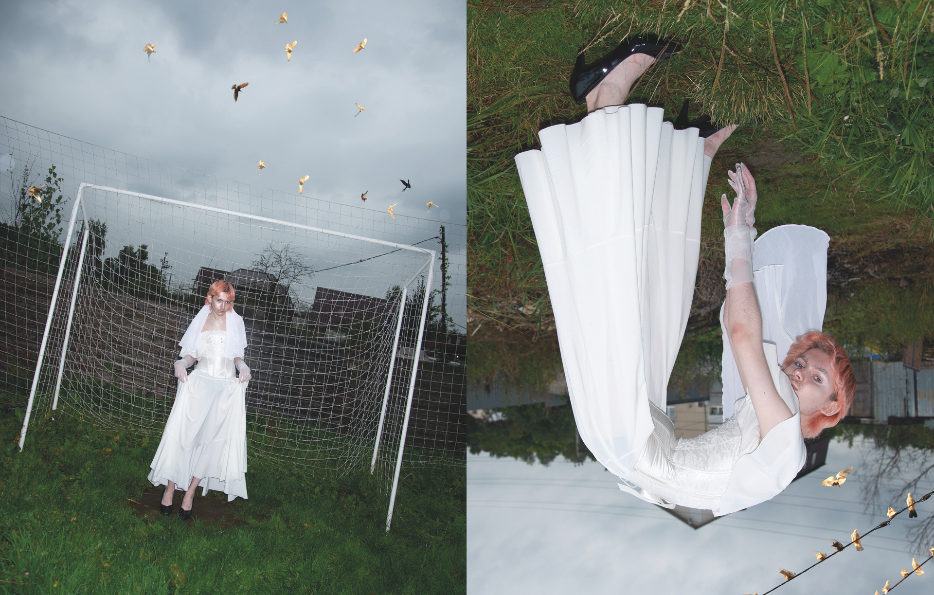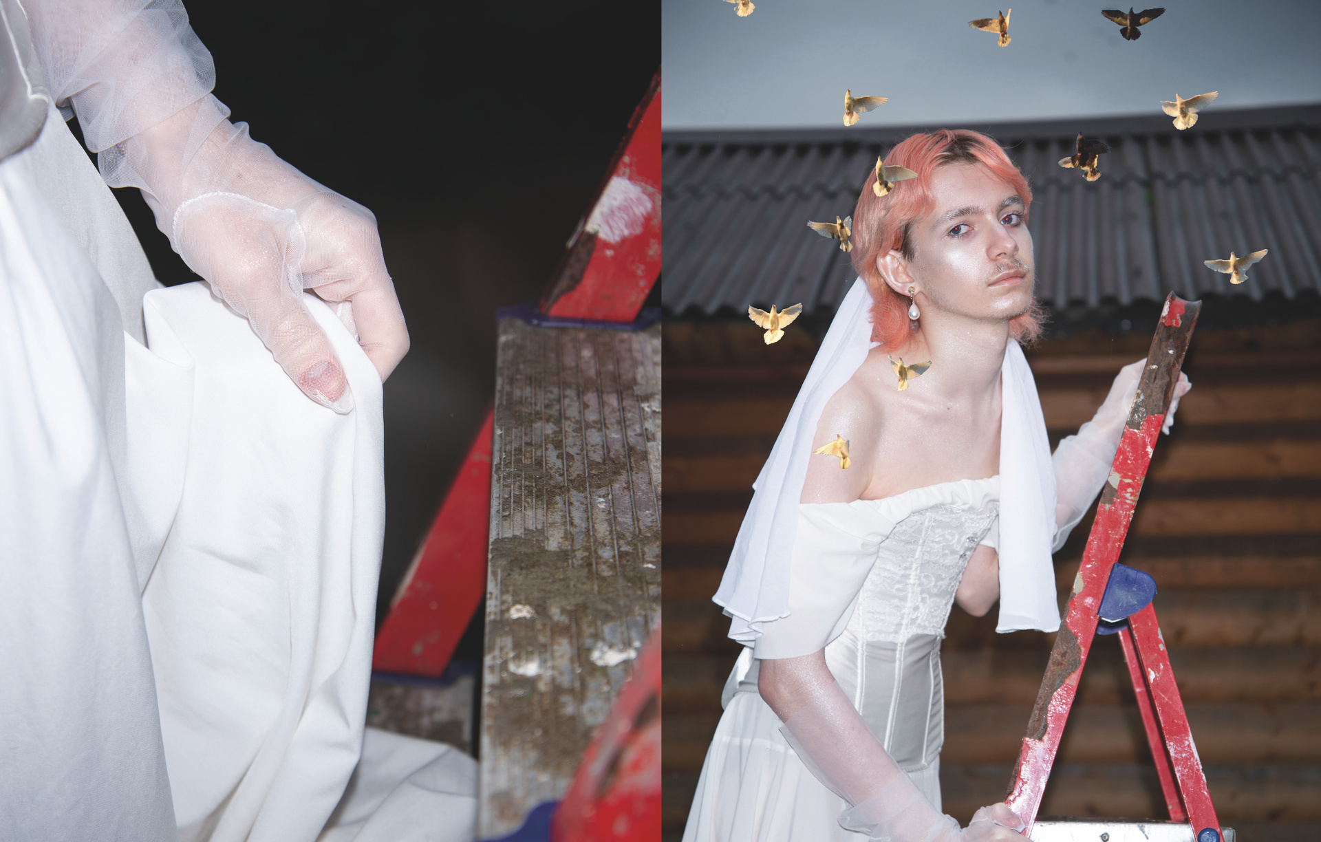 Невеста — небинарная персона и активистка — символизирует гендерную свободу в самоопределении и переоценку восприятия личности у моего поколения. В серии также есть некоторые атрибуты, связанные с моей семьей и происхождением — традиционные блюда, которые я с детства вижу на всех армянских застольях, и голуби из настоящей частной голубятни моего отца. Скрещивание таких разных частей моей жизни в одной съёмке — мой способ примирения с личным опытом и желание показать, что быть непохожим на свою семью в выборе ценностей, но при этом находить точки соприкосновения и адаптировать вековые традиции под себя — возможно и очень даже весело!