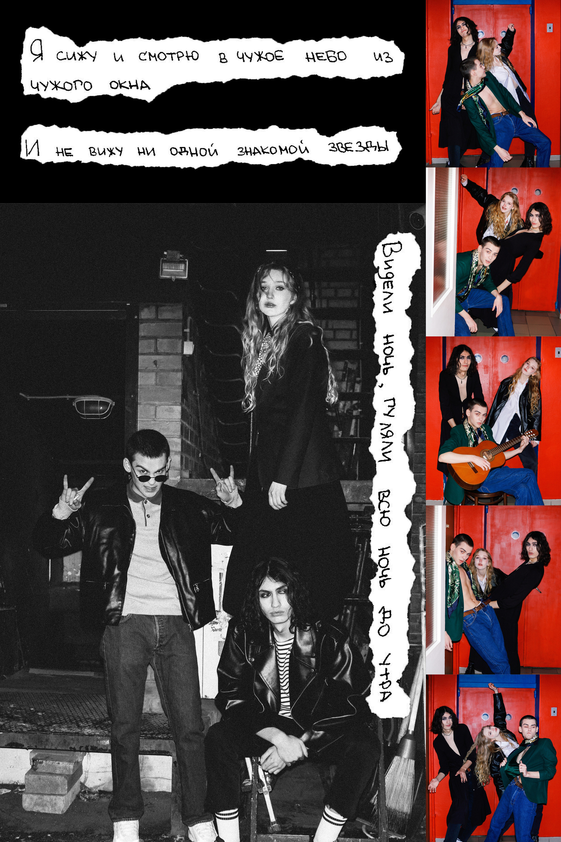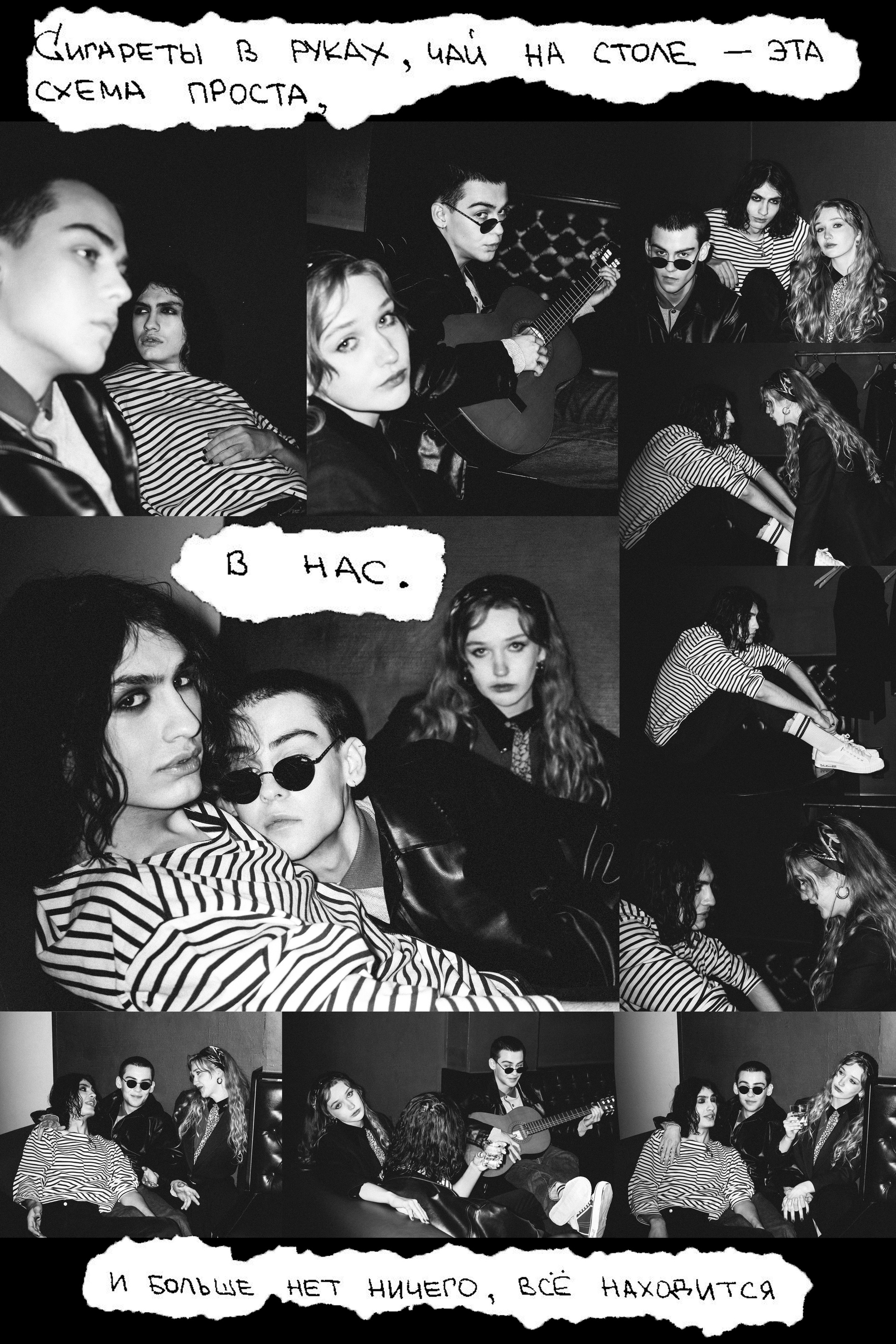 Съемка для выставки «Живой» в театре Современник, посвященная Виктору Цою. Серия фотографий воссоздает дружескую и непринуждённую атмосферу, царившую у музыкантов во время написания песен и другой совместной деятельности.
